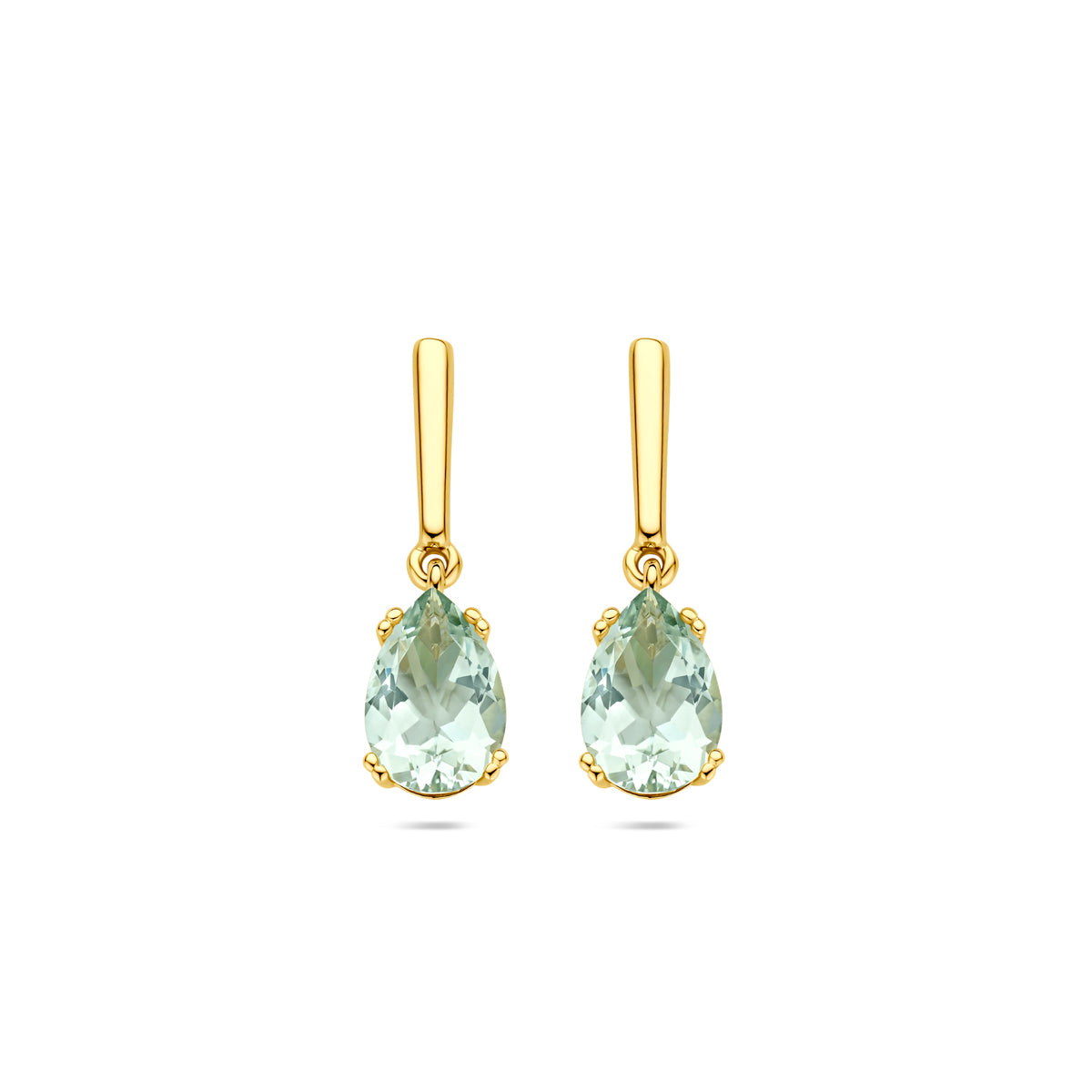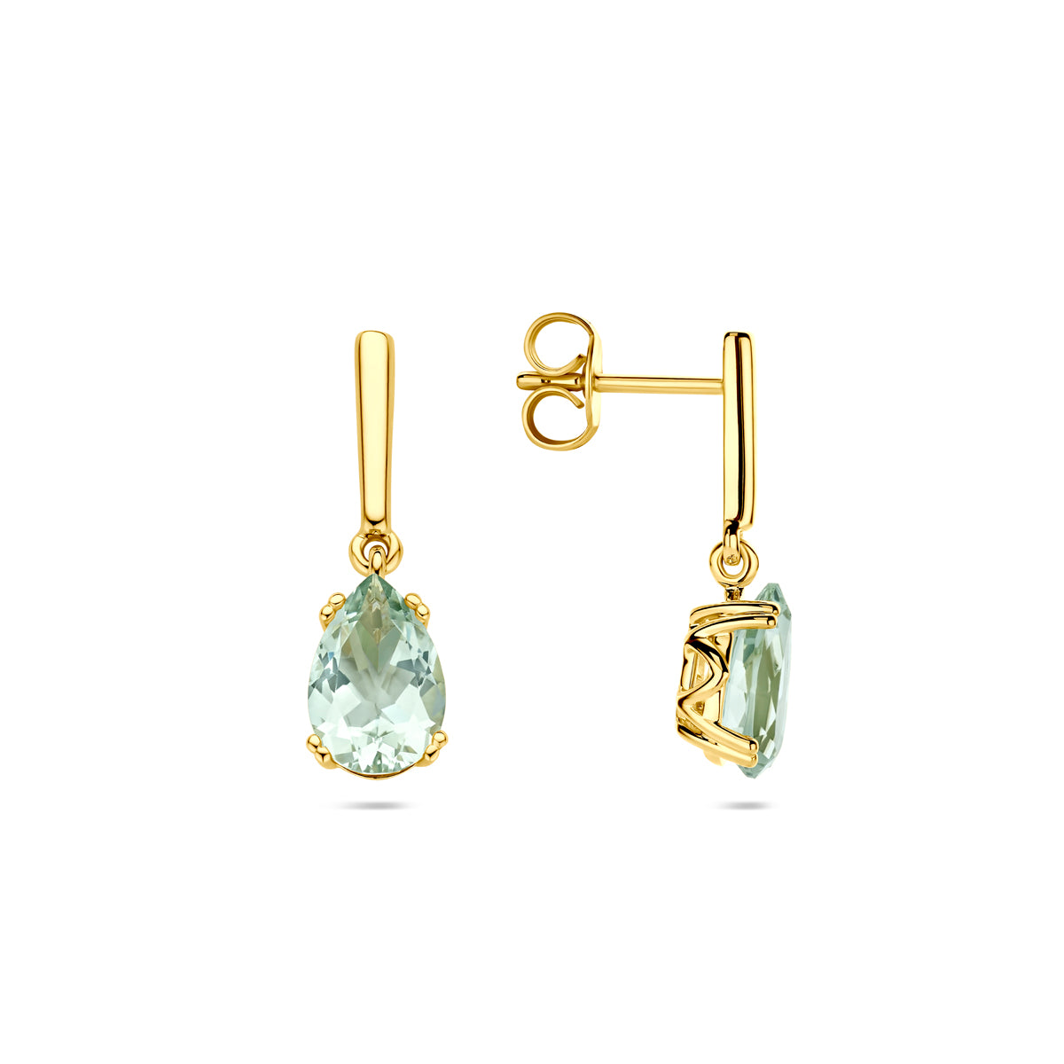 14k Geelgouden oorhangers uitgevoerd met groen amethist. De oorhangers hebben een totale hoogte van 20mm.