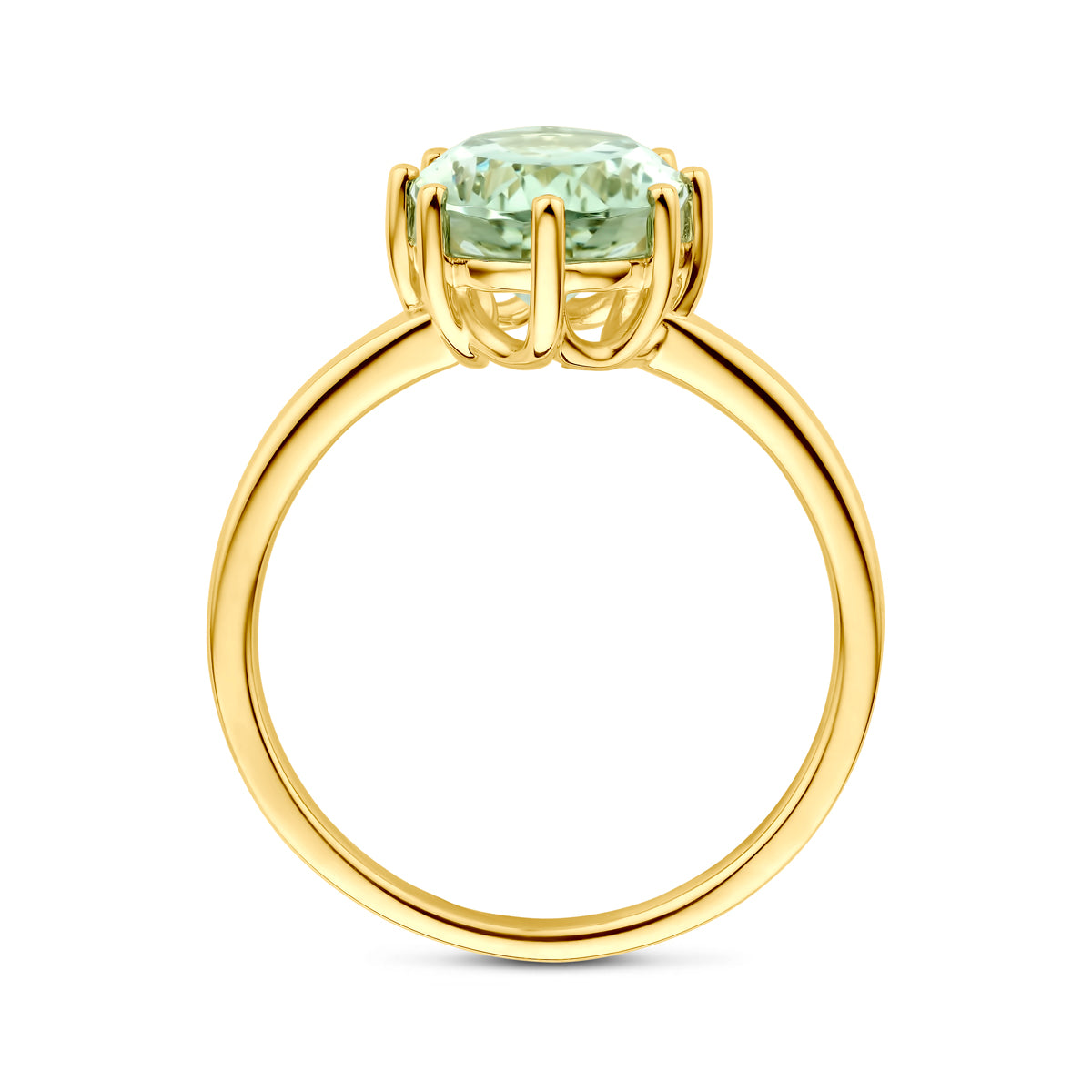 14k Geelgouden ring uitgevoerd met groen amethist. De steen heeft een afmeting van 12x8mm.