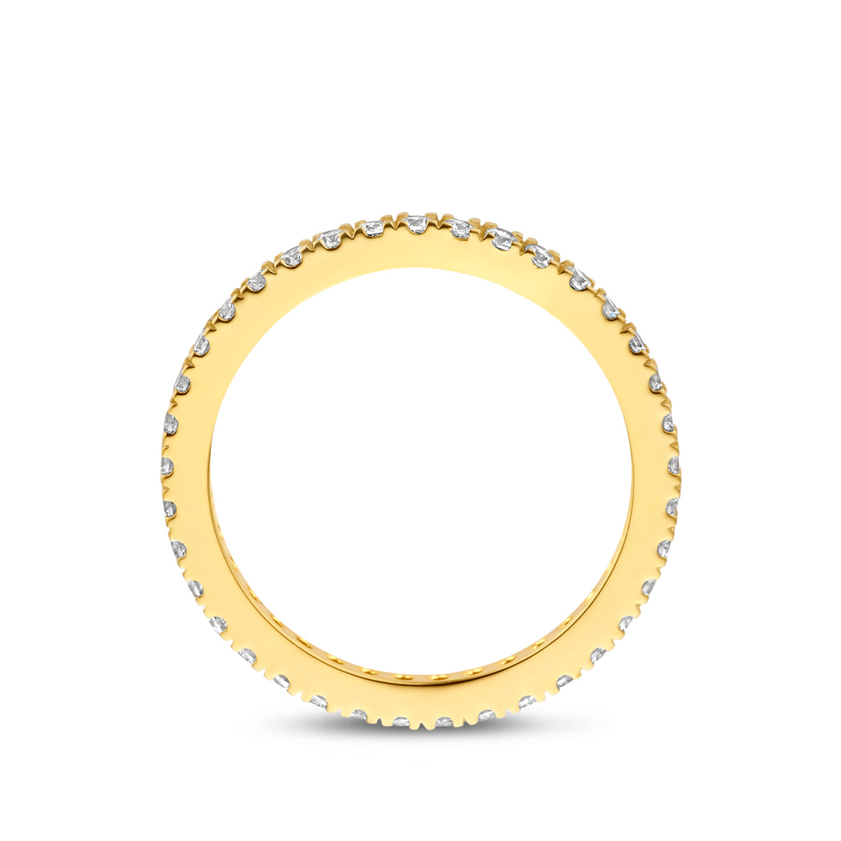 Deze elegante verguld geel 925 zilveren ring is verfijnd uitgevoerd met schitterende zirkonia stenen die zorgen voor een luxe en sprankelende uitstraling. De smalle band van 1.6mm breed geeft de ring een subtiele, minimalistische look, waardoor hij perfect is om solo te dragen of te combineren met andere ringen voor een trendy ring stack.