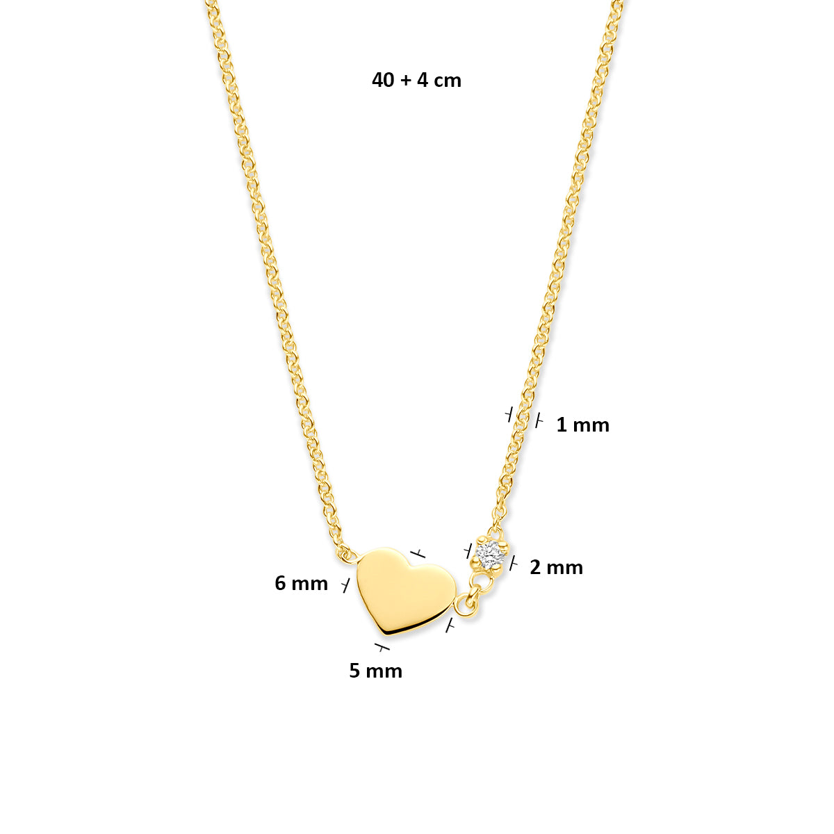 Het collier heeft een draaglengte van 40cm en is voorzien van een verlengketting van 4cm, waardoor het eenvoudig verstelbaar is tot 44cm. Hierdoor is het sieraad ideaal om solo te dragen of te combineren met andere colliers voor een trendy, gelaagde look. Het warme 14 karaat geelgoud laat zowel het hartje als de diamant prachtig tot hun recht komen.